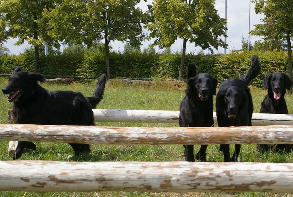 Helaas heb ik Ton nog niet zo ver gekregen om een keer mee te gaan naar de gehoorzaamheidstraining. Het lijkt mij namelijk heel leuk om foto’s te hebben van Fientje tijdens de training. Ik moest hier aan denken toen ik van de week bovenstaande foto tegenkwam, die ik een aantal jaar geleden tijdens een vakantie heb gemaakt. Onze caravan stond toen naast een terrein waar springpaarden werden getraind. Aan het eind van de dag liep ik dit terrein op om met mijn viertal een parcours te lopen. Ze vonden het geweldig. Het lijkt misschien simpel, maar om vier Flatcoats tegelijkertijd over de caveletti’s te krijgen is echt niet eenvoudig. Ze hebben namelijk, zoals een echte Flatcoat betaamt, een eigen inbreng en volgens mij dachten mijn dames: "Waarom moeilijk doen als het makkelijk kan". Om de gedachtegang van mijn dames te illustreren kun je op onderstaande foto’s de "making off" zien. Moraal van dit verhaal: "Het is super leuk en naar mijn mening erg belangrijk om wat met je Flatcoat te ondernemen. Of het nu jachttraining, reddingshondenwerk, agility of gehoorzaamheidstraining is. Het zorgt voor een sterke band met je hond en daarnaast is het nog eens erg leuk om te doen!