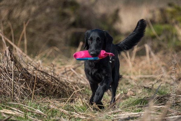 Ook qua werkaanleg ben ik meer dan tevreden. Fien is slim, leert snel en werkt in hoog tempo. Ze wil graag samenwerken en vindt apporteren geweldig. Aan eigen initiatief ontbreekt het ook niet. Ze heeft, net als de andere Flynnders, een super goede neus. Tijdens de puppytest had Willy een sleep met een haak getrokken. Alle Flynnders hebben deze sleep gelopen, echt waanzinnig! Natuurlijk heeft deze goede neus zijn keerzijde, regelmatig zie ik dat ze al van ver verwaaiing krijgt van allerlei viezigheid. Tot slot is Phoenix stoer, maar heeft daarnaast ook een gevoelig kantje. Niets mis mee, want dit maakt haar makkelijk te corrigeren. Fientje, mijn heerlijke wijfie, een Flatcoat dametje naar mijn hart!